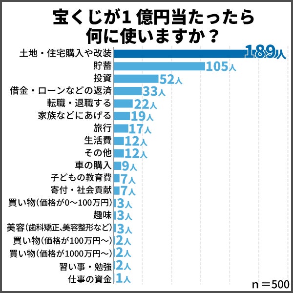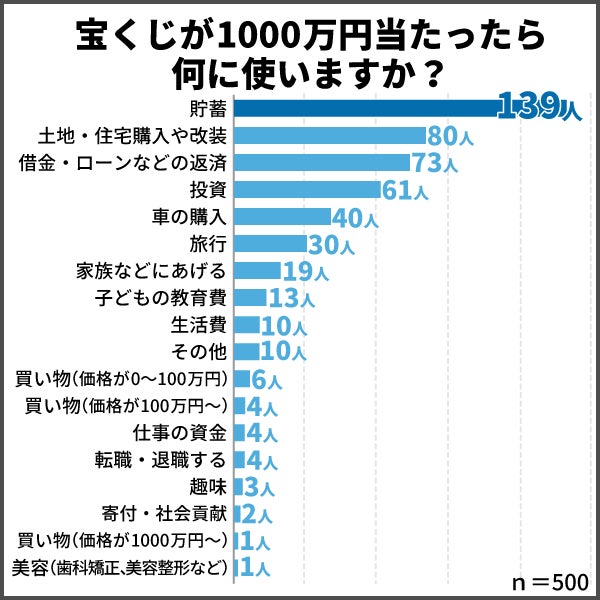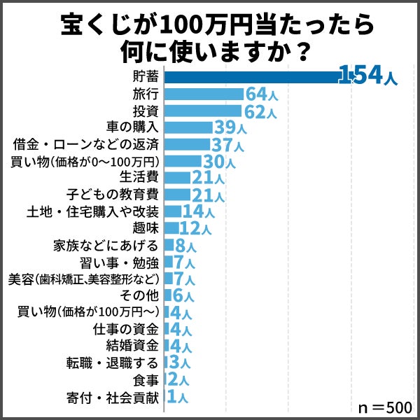 宝くじが100万円当たったら何に使う?1億円当たった場合は?男女500人に聞いた、当選金の使い道