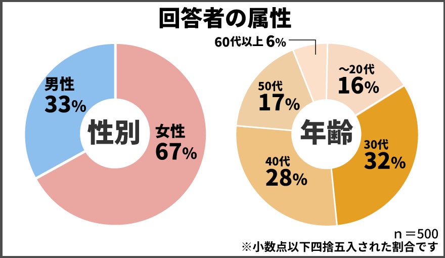 今回は男女合わせて500人の方にお聞きしています。性別と年齢の内訳は以下の通りです。