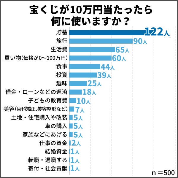宝くじが10万円当たったら、当選金額の使い道として最も多かったのは「貯蓄」でした。続いて「旅行」、「生活費」、「買い物(100万以下)」と並んでいます。