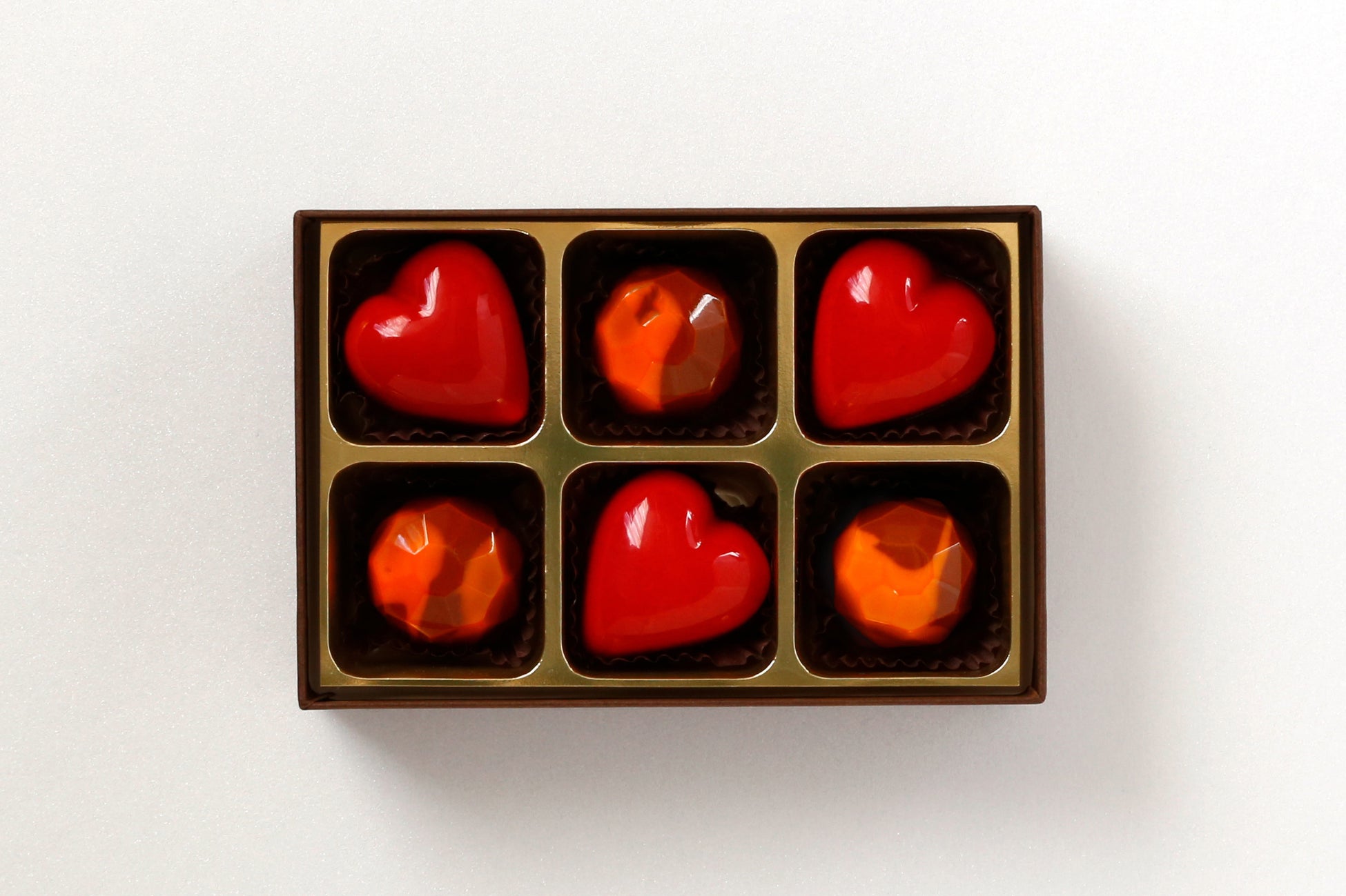 重慶飯店の銘菓「番餅(バンピン)」に使用している餡にチョコレートと生クリームを練り込んだガナッシュを、オレンジに色付けしたホワイトチョコレートでコーティング。 また愛らしい深紅のハート型のチョコレートの中には紹興酒を使用したガナッシュが入っています。