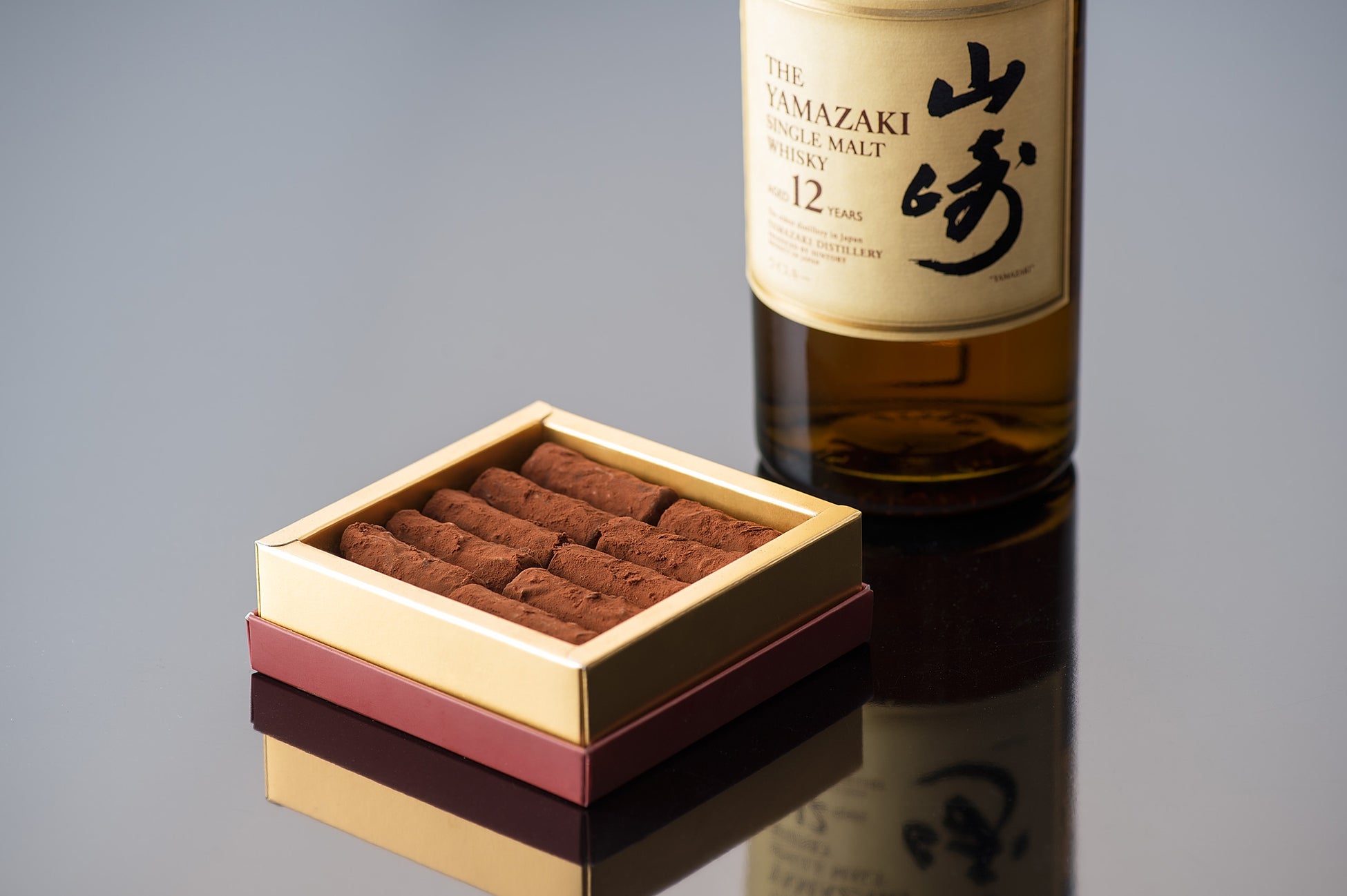 ホワイトオーク樽熟成原酒由来のバニラ香と熟し果実香が特徴の「山崎12年」を使用。ビンテージ山崎と、口溶け滑らかなスイートチョコレートが織りなす繊細で上品な甘さの大人の生チョコレート。