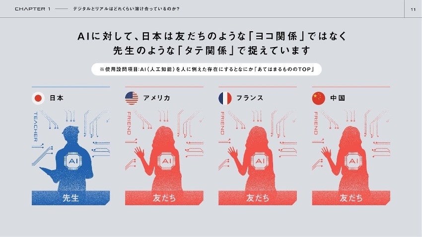 日本と海外諸都市に対して「デジタルとリアルがつながった社会に対して賛成か?反対か?」と問いかけると、海外は意見がどちらかにわかれる一方で、日本は完全に半分半分になりました。日本は今、日本らしいデジタル化の方向性を見つける過渡期にあるのではないか?そんな問いを持って、本レポートではデジタルとリアルを切り分けずに人生を豊かにする「メタサピエンス」という考えを提唱。誰かを取り残してしまうような可能性のあるデジタル化でなく、人と人、人とAI、人と社会が人間らしいつながりで豊かになるデジタル化を、未来への兆しとして感じていただけると幸いです。