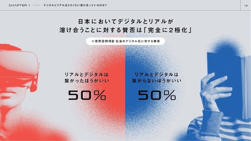 1.日本においてデジタルとリアルが溶け合うことに対する賛否は「完全に2極化」(図①)