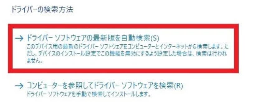 Step4:「ドライバーソフトウェアの最新版を自動検索」を選択します。