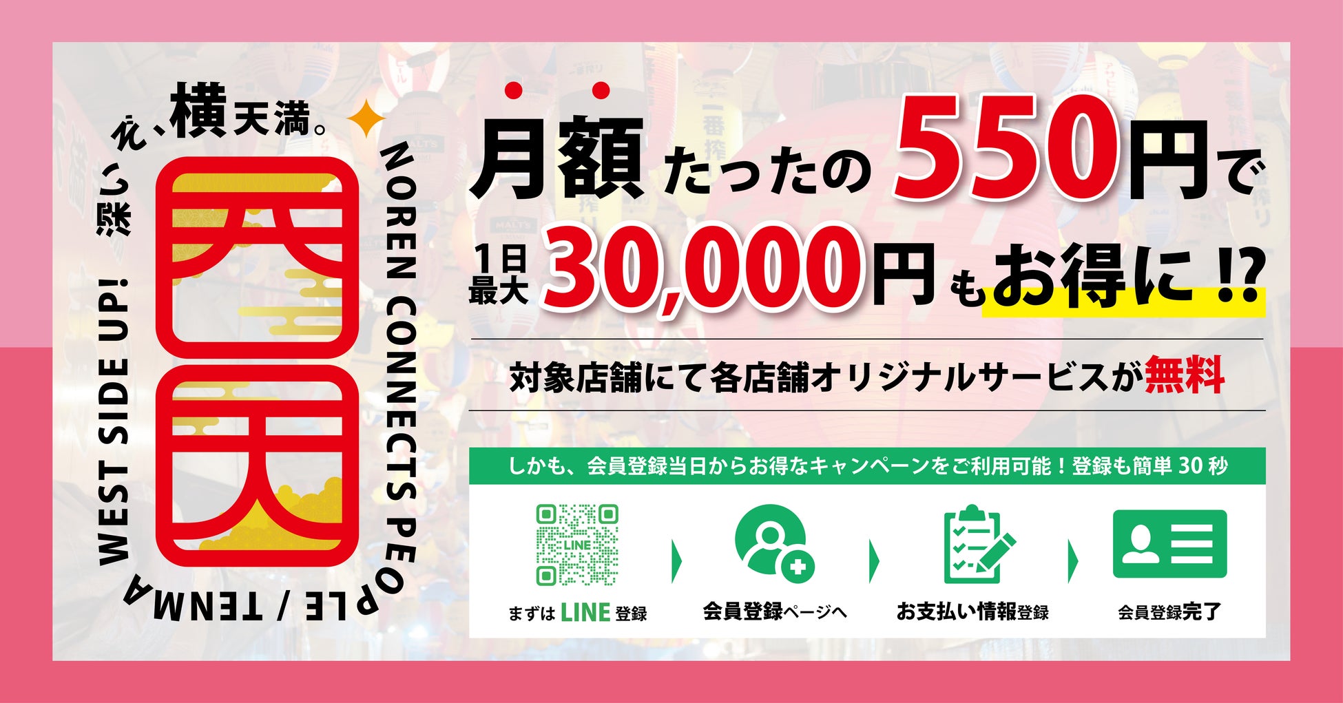 大阪JR天満の西側に位置する大人ディープなエリア横天満の加盟店にて、フード、ドリンク、割引サービスが受けられるサブスク「TENMA WEST SIDE UP!」提供開始