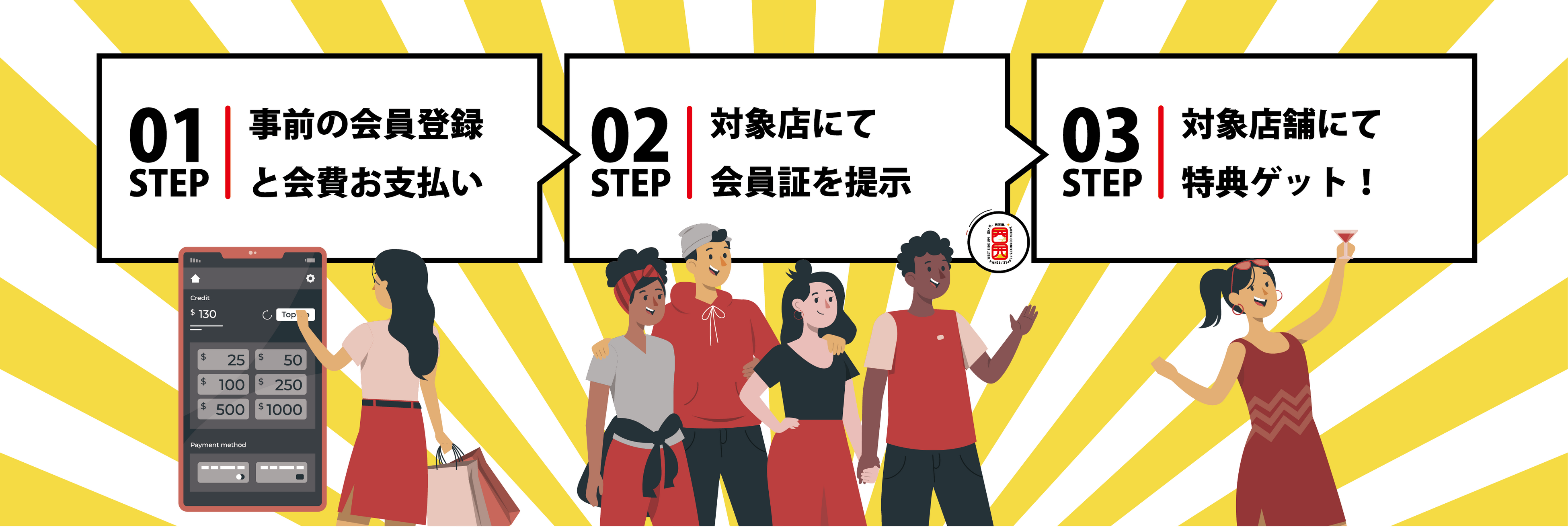 内容:横天満の加盟店舗にて無料でフード、ドリンク、割引サービスがご利用可能