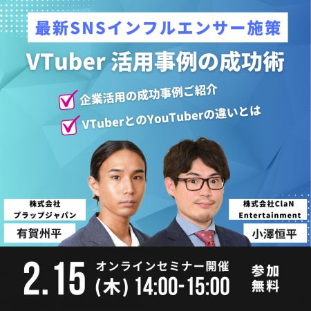 株式会社ClaN Entertainment(本社:東京都港区、代表取締役社長:大井基行、以下 ClaN)はPR発想であらゆるコミュニケーション活動を支援する、株式会社プラップジャパン(本社:東京都港区、代表取締役社⻑:鈴⽊勇夫、以下 プラップジャパン)と共同で提供する若年層向けPRサービス『VTuber コミュニケーションサービス』のローンチに際し、この度オンラインセミナーを開催します。