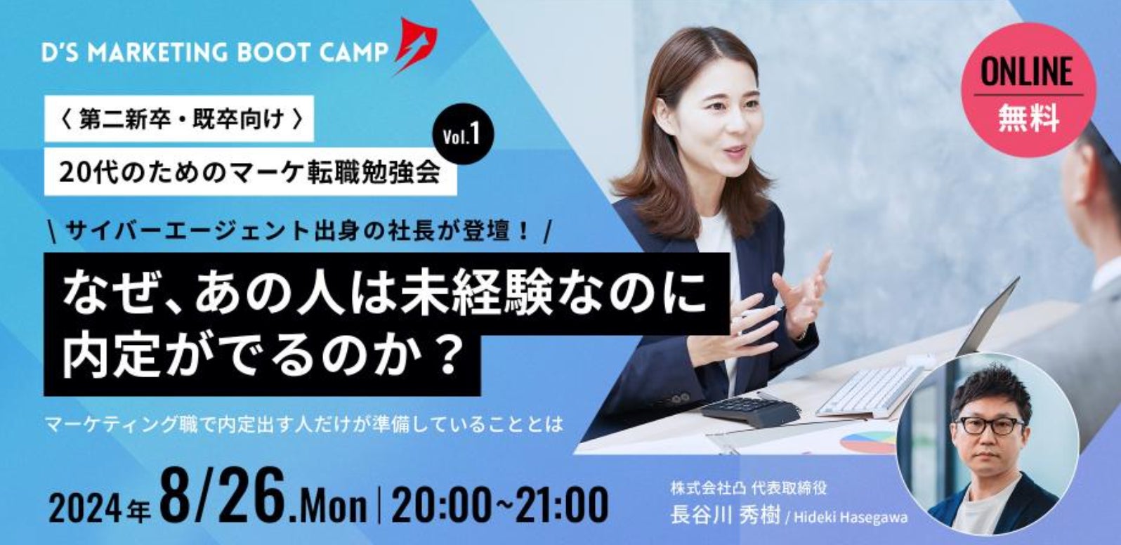 D-CAMは2024年8月26日(月)に、20代のマーケティング職希望者を対象としたオンラインセミナー「第二新卒・既卒向け 20代のためのマーケ転職勉強会Vol.1」を開催しますのでお知らせいたします。