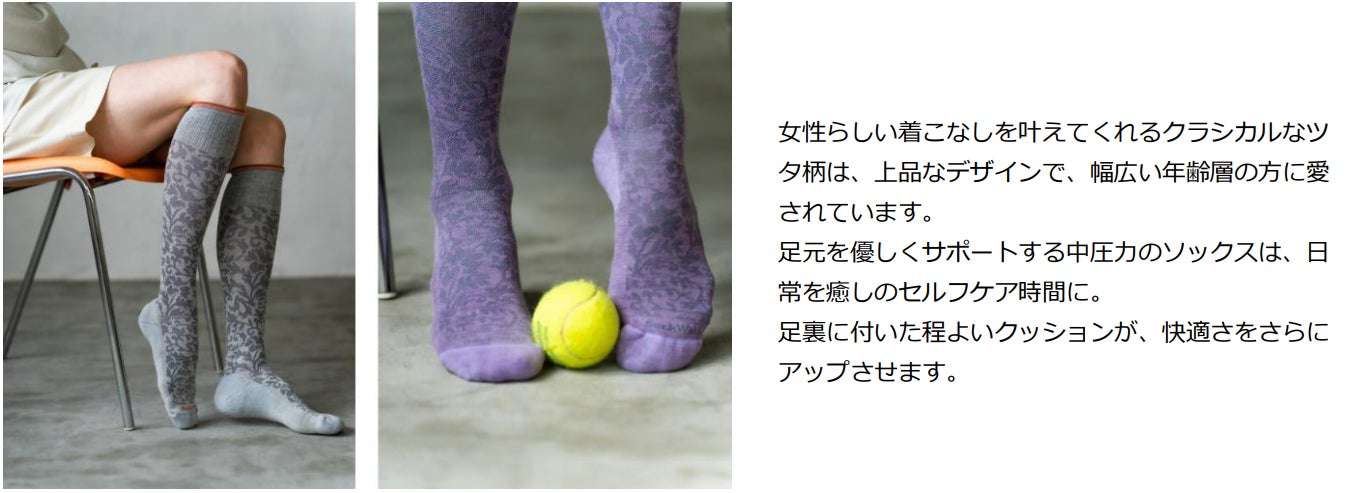 アメリカに本拠地を持つソックウェルは2008年に創業し、時代の流れ、ファッションのトレンド、花などの自然のモチーフからインスパイアされた、色とりどりの美しいデザインのセルフケアソックス(着圧ソックス)を展開しています。