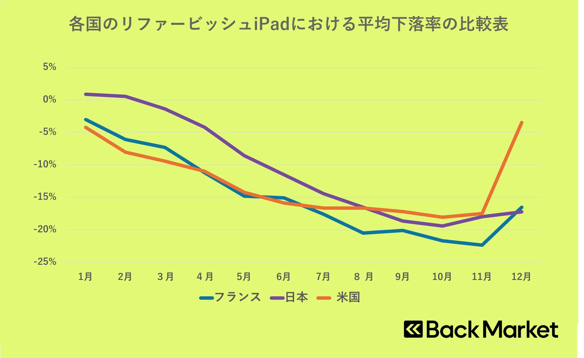 2025年のリファービッシュ市場において、iPhoneは各国で1月から4月にかけて価格下落が進む傾向が見られました。昨年のように9月の新製品発売を起点とした下落とは異なり、年始から新生活シーズンにかけて価格下落が進みました。新生活以降は国ごとに差が見られ、フランスと日本は年間を通して下落が続いた一方、米国では、夏から初秋にかけて価格下落が一時的に落ち着き、10月以降に再び下落が進む動きとなりました。一方、iPadシリーズ全体ではiPhoneシリーズと比べて価格下落の幅が大きく、日本では最大19.4%の下落を記録しました。一方、フランスや米国では10月まで下落が進行するものの、11月から12月にかけて下落が鈍化しており、ブラックフライデーやクリスマス商戦に伴う需要の高まりが価格を下支えした可能性が考えられます。
