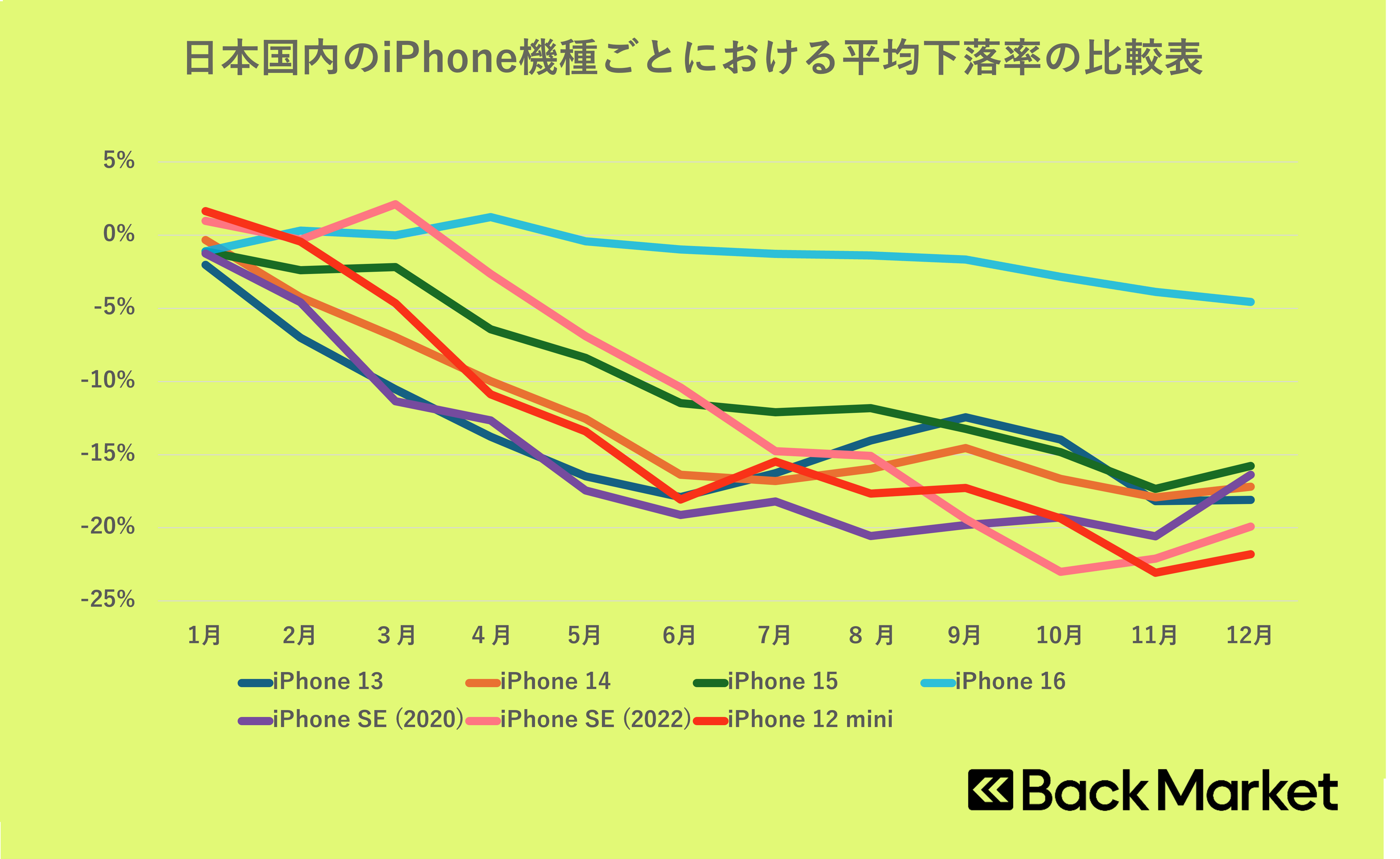 日本国内の機種ごとにおける平均価格の比較表では、iPhone 12 miniが価格下落率1位を記録し、続いてiPhone SE (2022)、iPhone SE (2020)がランクインしています。全体的な傾向として、新生活シーズンが落ち着く5月以降から夏にかけて価格下落する傾向が見られ、特に、発売から2年以上が経過した機種では、年間を通じて15%を超える下落率を記録しました。