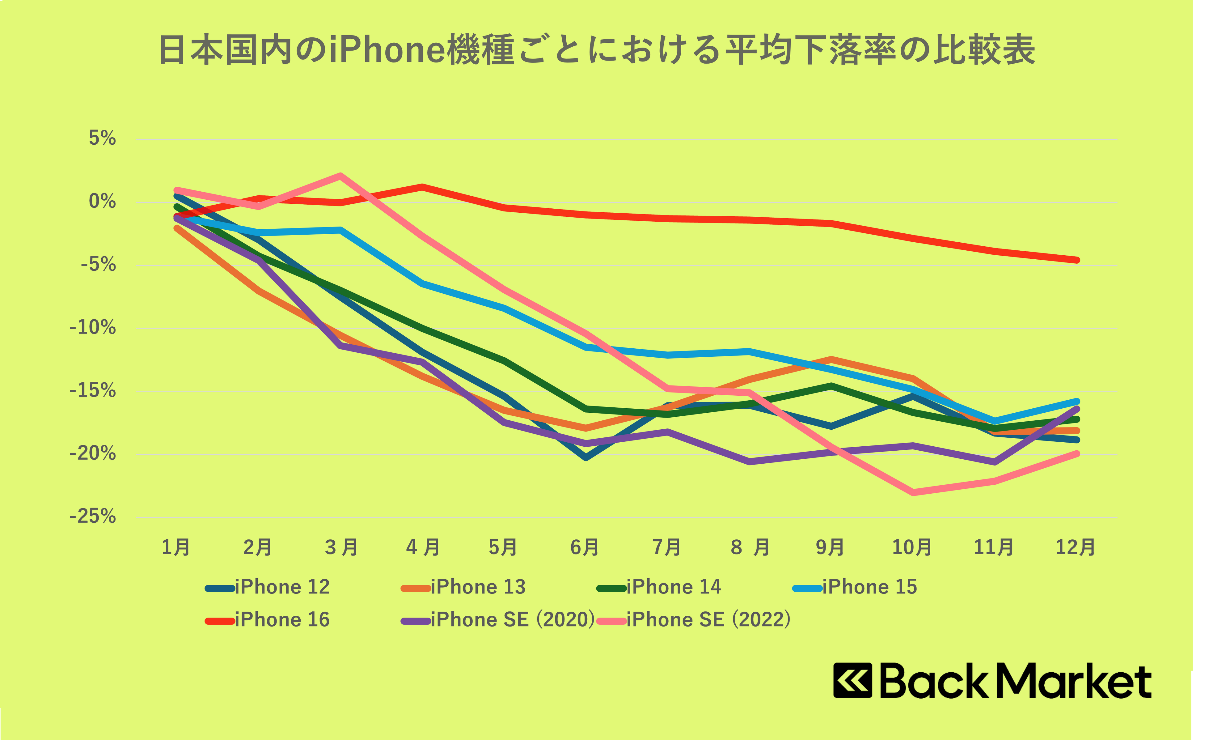 iPhoneシリーズ全体において年始から新生活時期に大きく下落し、最大下落時の平均で19%下落