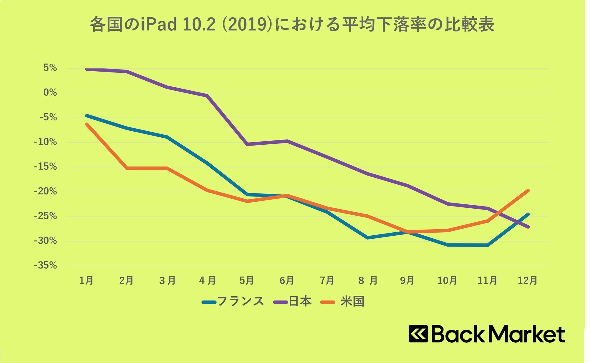 2025年に日本で価格下落率ランキング1位となったiPad 10.2(2019)は、フランスや米国でも価格下落が進み、フランスでは最大下落率30.8%となりました。各国の推移を見ると、1月から4月にかけて下落が進んでおり、3月のiPad新製品発売を受け旧世代モデルの価格下落が加速したと考えられます。