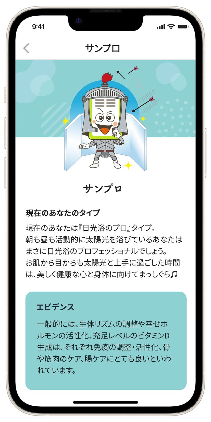 本デバイスおよび専用アプリは、国立環境研究所の中島英彰先生が監修し、当社が開発した独自のビタミンD生成アルゴリズムや、機能性医学専門家の斎藤糧三先生・睡眠研究専門家の白川修一郎先生が監修した健康期待値のアルゴリズムにより、日光浴の目標・上限の目安時間を数値化する【集中モード】に加え、新たにゲーム感覚で楽しめてお出かけをサポートする自動計測タイプの【楽々モード】の2パターンをご使用頂けます。