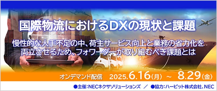 NECネクサソリューションズ株式会社は、フォワーダー様向けセミナー「国際物流におけるDXの現状と課題」を2025年6月17日(火)より8月29日(金)までオンデマンド配信します。お申し込みは8月28日(木)まで受け付けています。