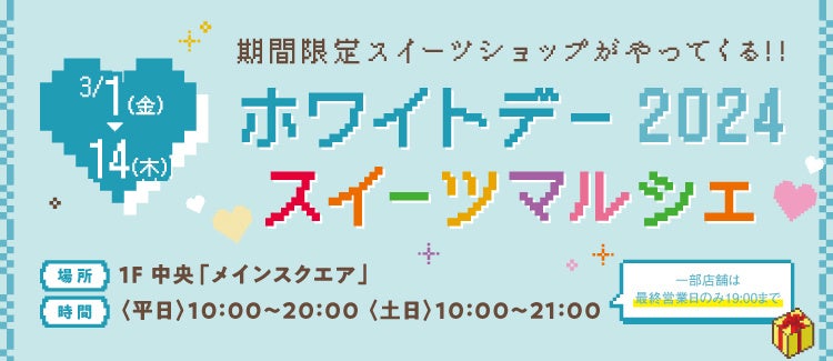 【開催概要】 期間:3月1日(金)~3月14日(木) 時間:〈平日〉10時~20時 〈土日〉10時~21時 ※小樽洋菓子舗ルタオ「LeTAO」、シュクレイ「ザ・メープルマニア」は最終営業日のみ19時まで営業します。 場所:1階 中央「メインスクエア」 サイトURL: https://mitsui-shopping-park.com/lalaport/togo/cp/pdf/2302_whiteday.pdf |