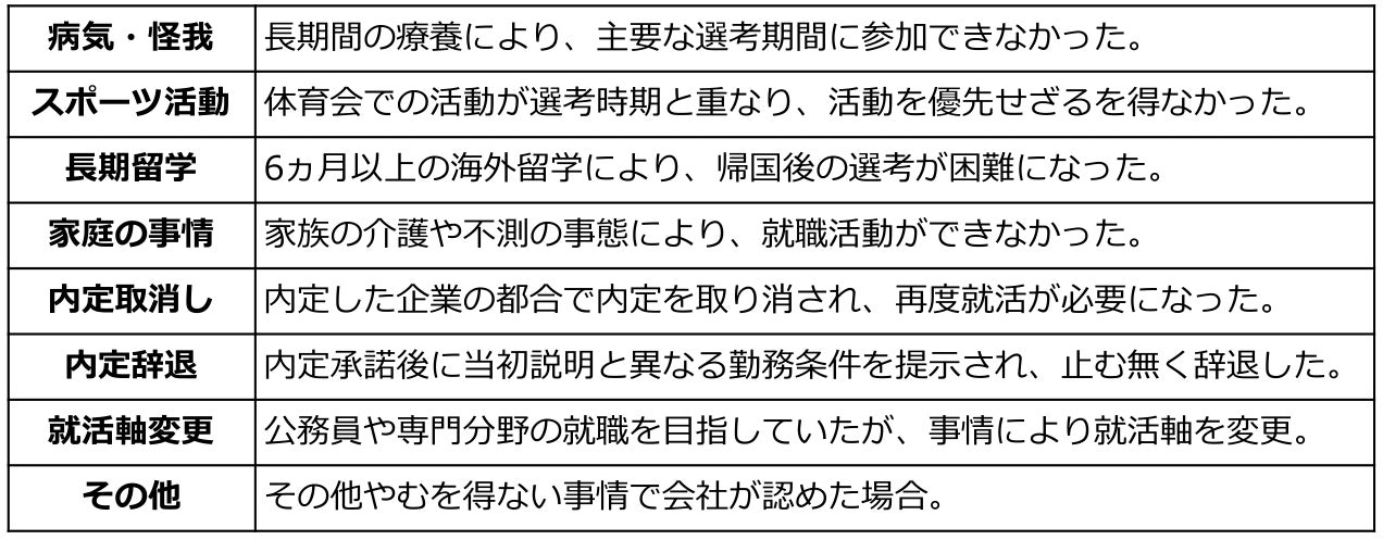 特別な事情(下表参照)により就職活動の期間を逃した2026年3⽉卒業⾒込みの⼤学・短期⼤学・専⾨学校⽣、および既卒3年以内の⽅