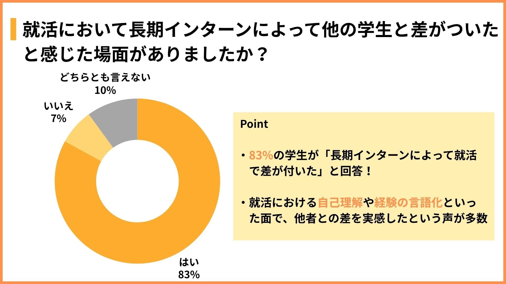 「就活において長期インターンによって他の学生と差がついたと感じた場面があったか?」という質問では、83%が「はい」と回答。自己理解や経験の言語化といった点で、他者との差を実感したという声が目立ちます。