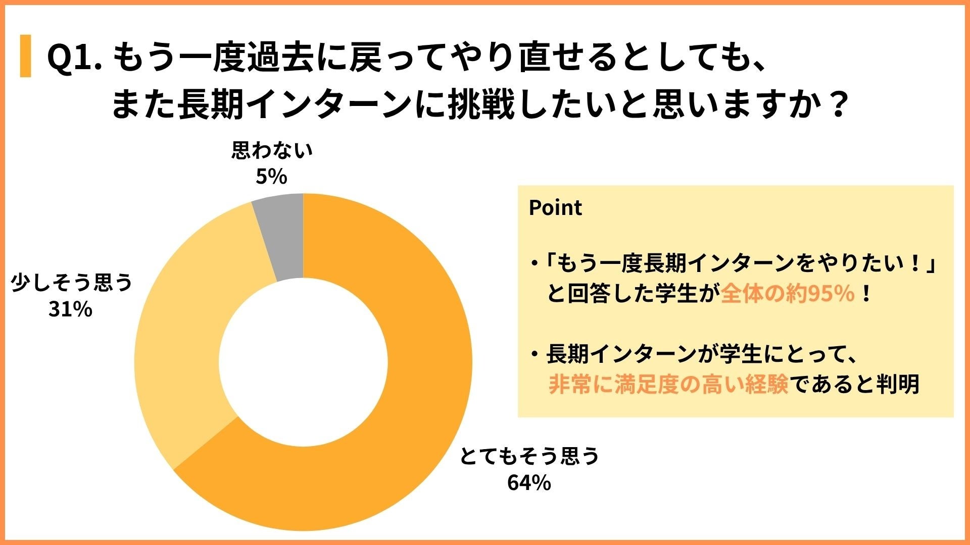 「もう一度過去に戻ってやり直せるとしても、また長期インターンに挑戦したいと思いますか?」という質問に対し、95%が「はい」と回答。
