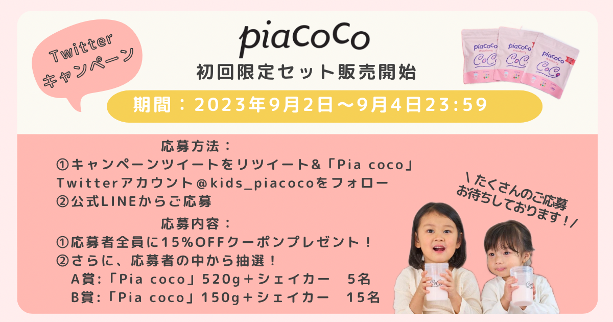 この度、キッズプロテイン「Pia coco」の初回限定セット販売開始に際して、Twitterキャンペーンを実施!詳細を説明いたします。