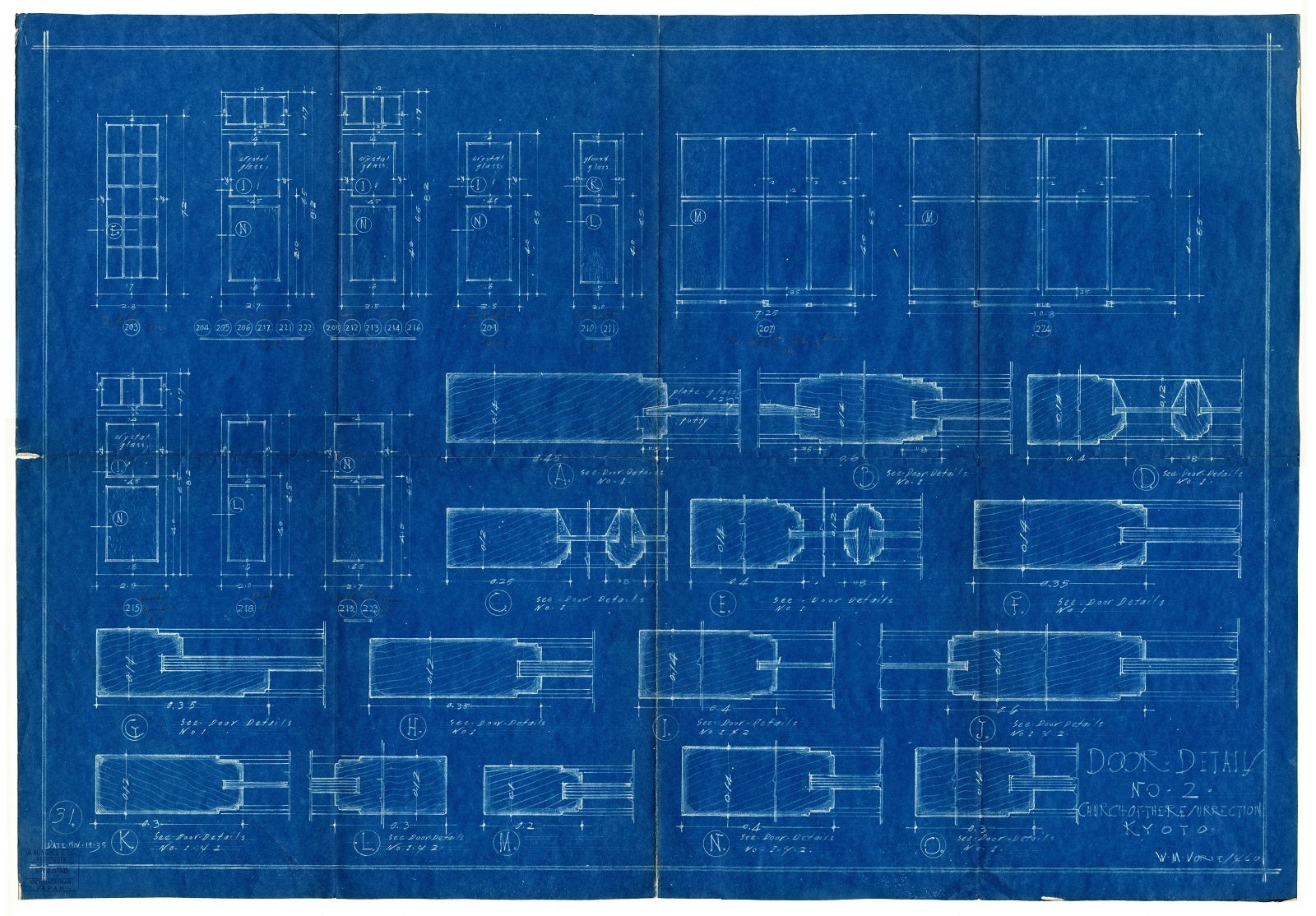 京都復活教会が所蔵しているヴォーリズによる図面から、礼拝堂の青写真2枚・白黒図面7枚と、京都復活教会北小松研修所キャンプロッジ建物図面の青写真1枚をお送りします。建具など詳細な設計を見ることができます。またヴォーリズによるロッジの設計は珍しく、興味深い資料です。