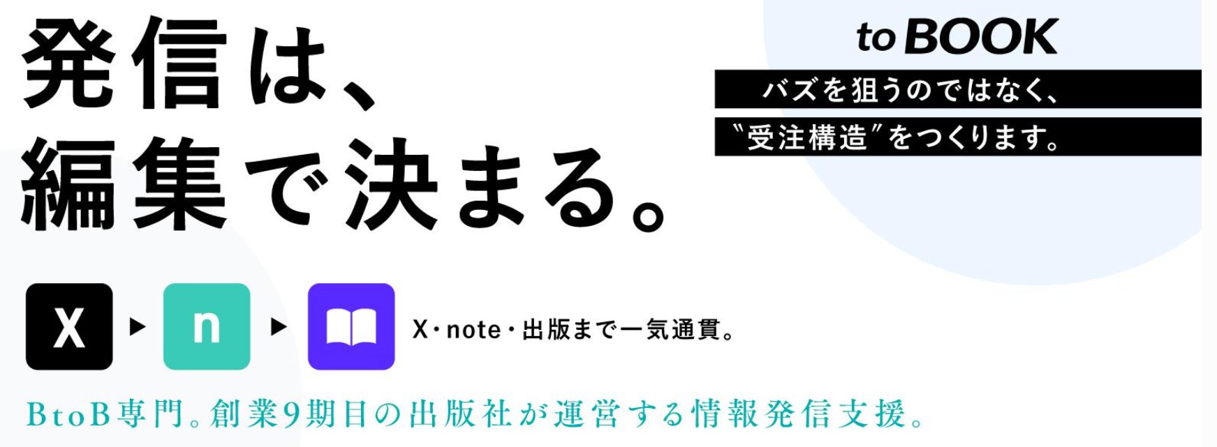 ラーニングス株式会社(本社:東京都渋谷区 代表取締役:梶田洋平)は、BtoB企業を対象とした情報発信支援サービス「toBOOK」(https://tobook.click/)の提供を開始いたしました。媒体設計からX・note運用、書籍出版まで、一気通貫で伴走支援します。