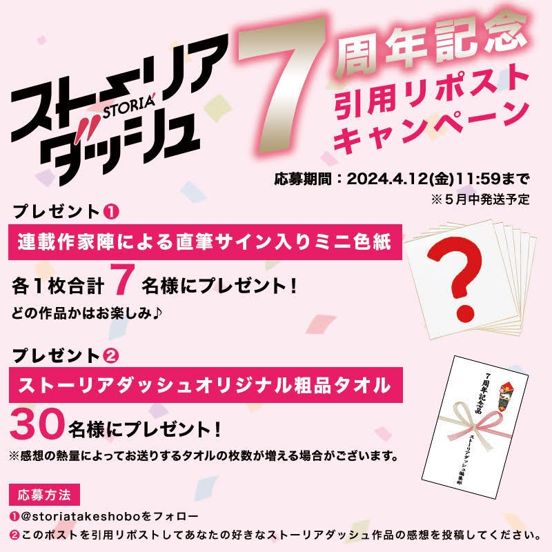 公式アカウントをフォローして、ストーリアダッシュにて連載中のお好きな作品の感想を添えて該当のポストを引用リポストしていただいた方の中から抽選で、連載陣7名の直筆サインミニ色紙や7周年特製粗品をプレゼント。ぜひ一緒にストーリアダッシュ7周年を盛り上げてください!