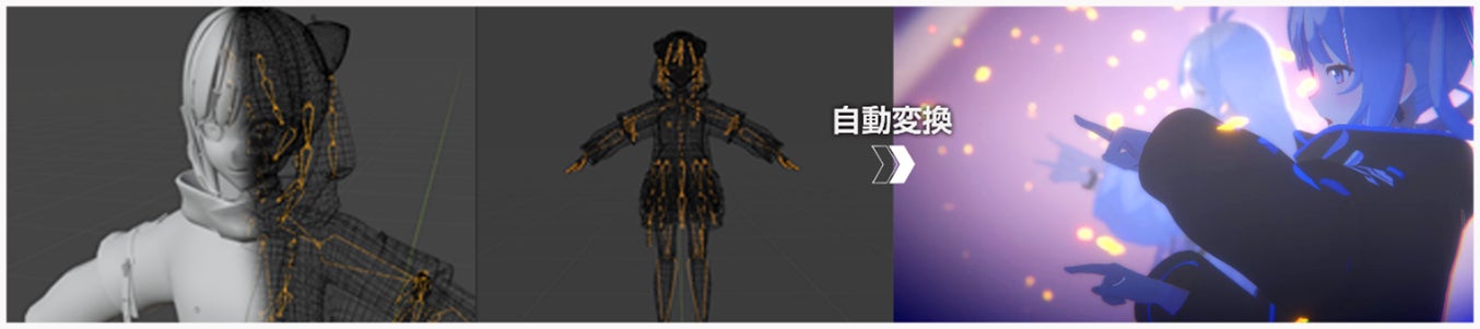 一般的なXRライブシステムでは、利用するシステムごとにセットアップを行いキャラクターモデルを修正・調整する必要がある場合もあります。本システムでは自社・他社を問わず、バーチャルキャラクターモデル導入におけるデータ構造を最適化するツールを開発し、従来は手動で行われていたアバターモデル形式からの変換を自動化します。