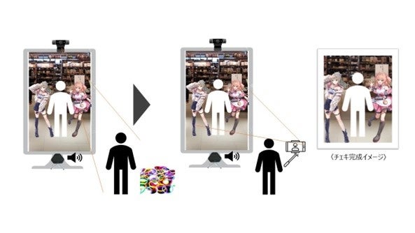 SHIBUYA TSUTAYA 1Fに設置された4台のモニターの前で、”推しVTuber”との記念撮影をお楽しみいただけます。モニターには店舗内の映像が投影されており、自身の姿が鏡のように映ります。そこに”推しVTuber”が映り込むことで、あたかも同じ空間にいるような体験ができ、一緒にチェキの撮影が可能です。