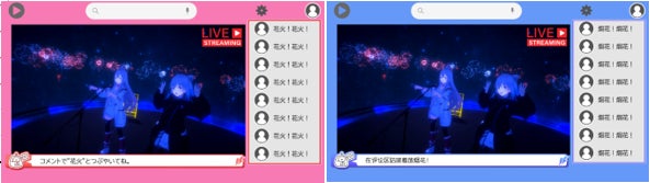 配信サイトの「コメント」や「投げ銭」などの機能と連携することで、バーチャル空間の演出をインタラクティブに行えます。例えば、日本と中国の動画配信サイトにバーチャルライブを同時生配信してそれぞれの言語で応援コメントを入れると、リアルタイムに花火が打ち上がるなど、さまざまな国の人が参加しながらライブを楽しむことが可能です。また演出表現は、コンテンツの世界観に合わせて柔軟な対応が可能です