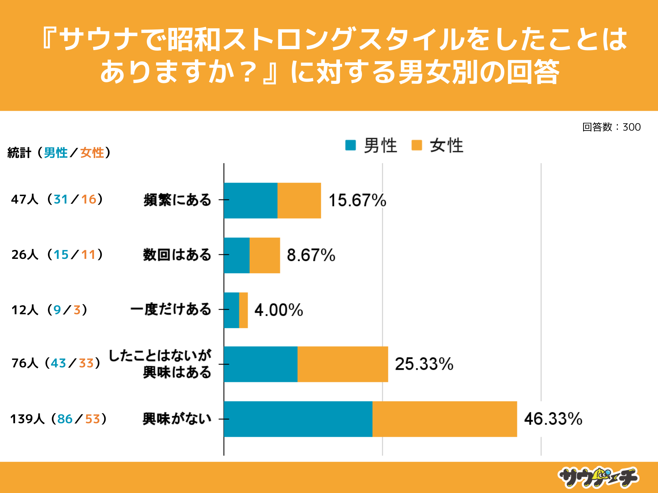 10〜30代男女を対象とした『サウナで昭和ストロングスタイルをしたことはありますか?』というアンケートで、最も多かった回答は「興味がない」で46.33%でした。