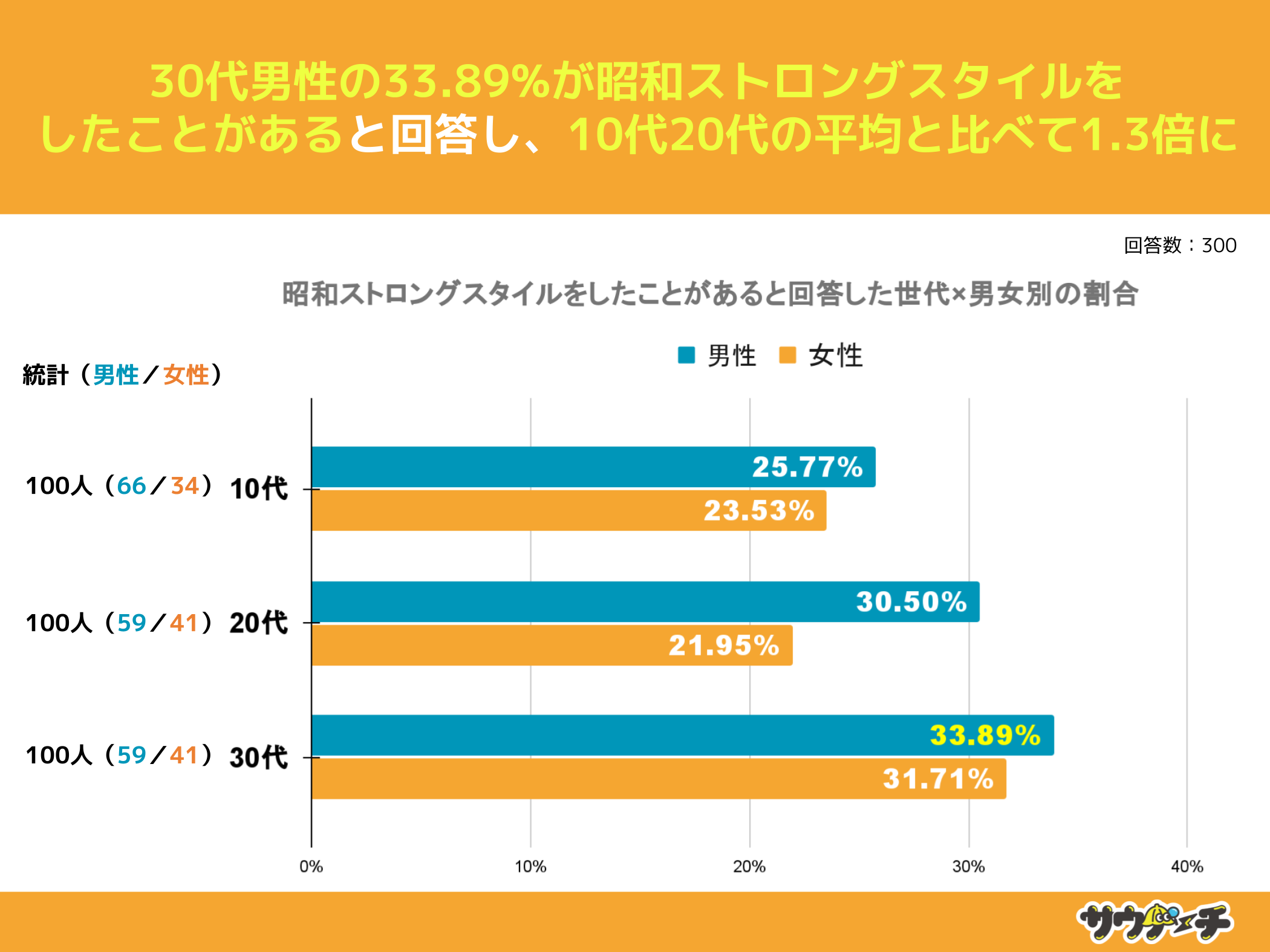 【30代男性の33.89%がサウナで昭和ストロングスタイルをしたことがあると回答し、10代20代の平均と比べて1.3倍に】