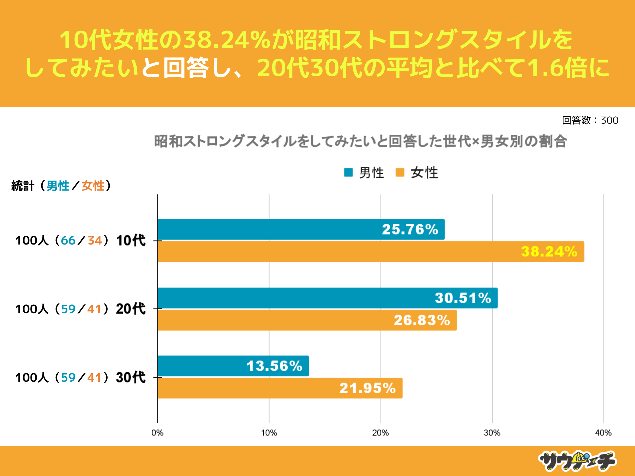 サウナで昭和ストロングスタイルをしてみたいと回答した割合を世代×男女別でみてみますと、10代女性の38.24%が最も高く、次いで20代男性の30.51%、20代女性が26.83%で、20代30代の平均と比べて10代女性は1.6倍高い結果となりました。