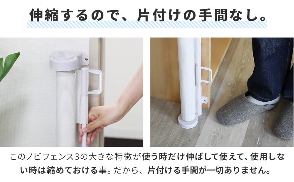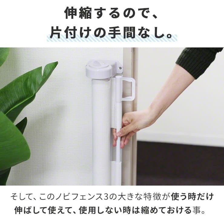 新デザインのフェンス「ノビフェンス3」はネジ止めと貼り付けの取り付け方法を選べ、ロック機能で子供の安全を確保。足元はバリアフリーで移動がスムーズ。メッシュ素材で向こうが見える。