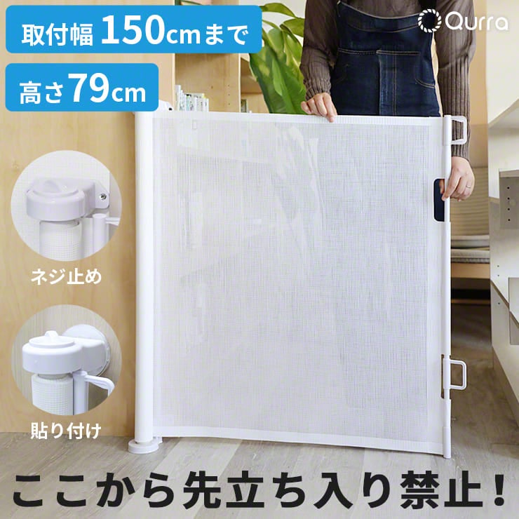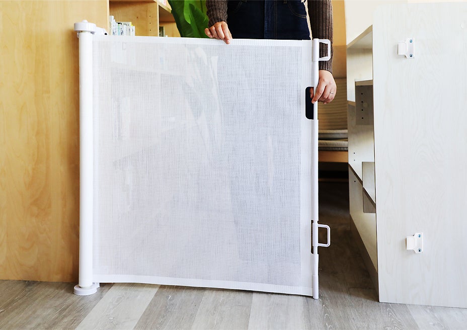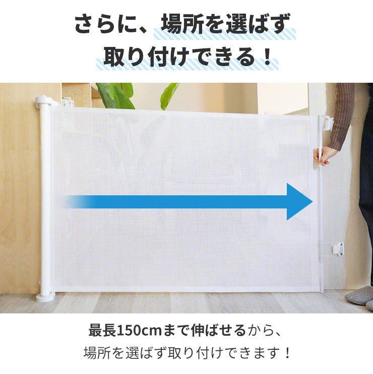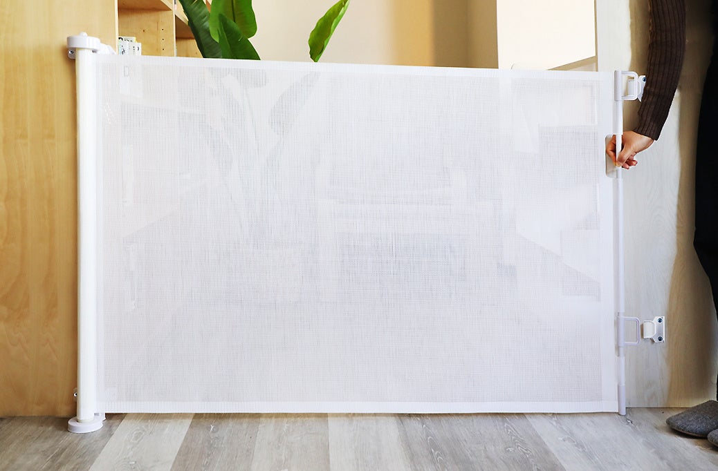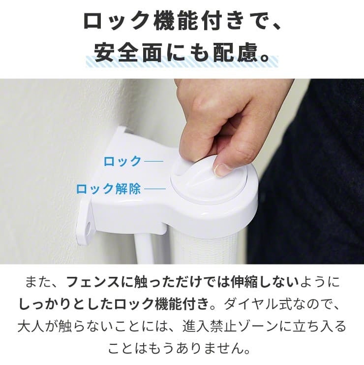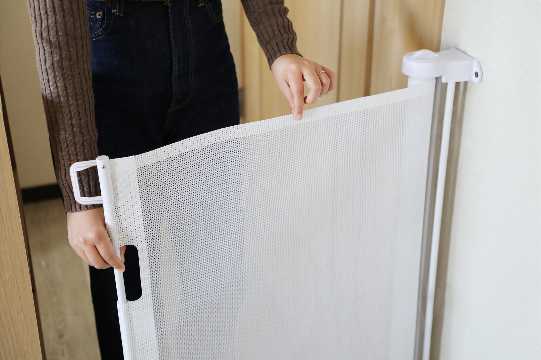 この製品は、使用時に伸ばし、不使用時に縮めることができる伸縮性を持ったフェンスです。台所、廊下、玄関など、お好きな場所に取り付け可能で、安全性を考慮し、ロック機能を搭載しています。さらに、足元の段差がないバリアフリー設計で、移動がスムーズに行えます。メッシュ素材を使用しているため、向こう側が透けて見えるので安心です。