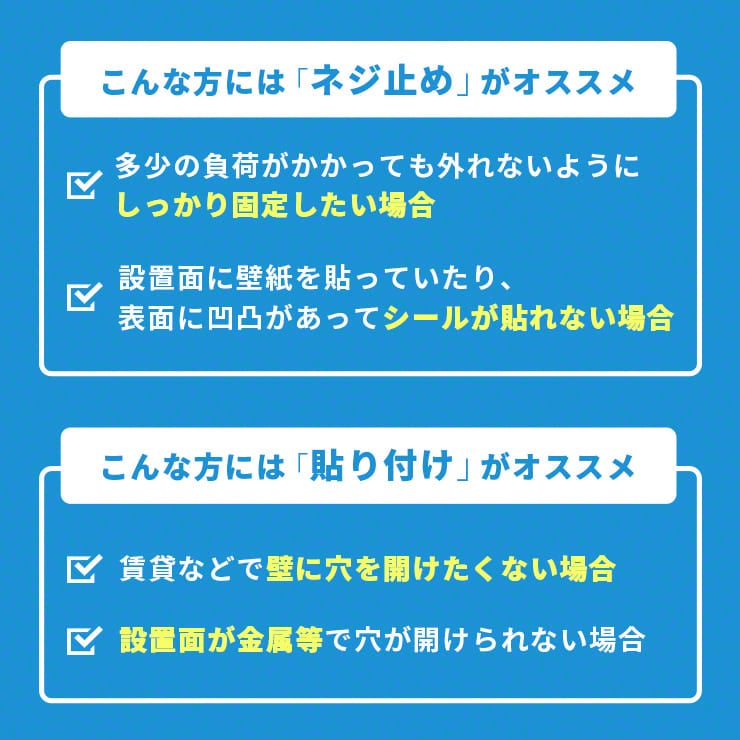 選べる取り付け方法:初のネジ止め式と貼り付け式が選べるデザイン。
