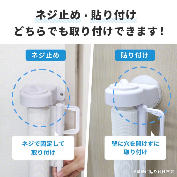 例:キッチンの壁にはネジ止め式でしっかりと固定し、リビングのガラス窓には貼り付け式で取り付けることができます。これにより、場所や材質に合わせて最適な取り付け方法を選べます。