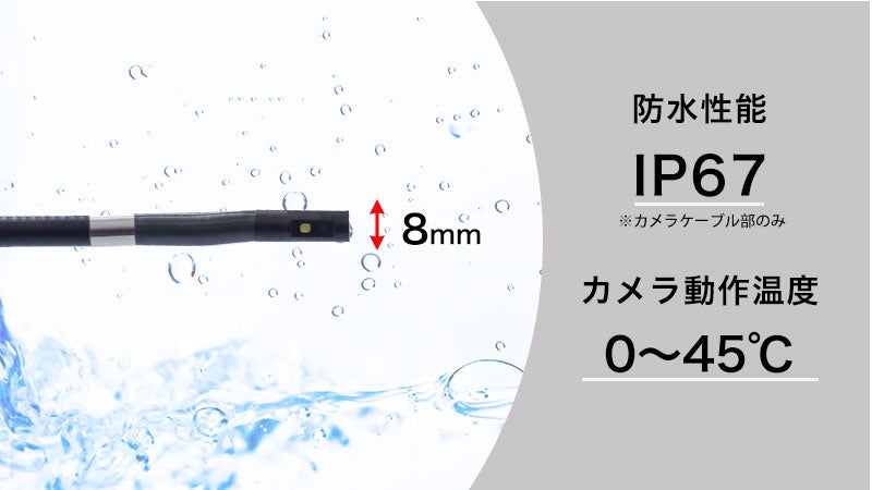 ・防水性能/IP67(カメラケーブル部のみ) ・動作温度/0~45℃ ・USBケーブル長/約900mm