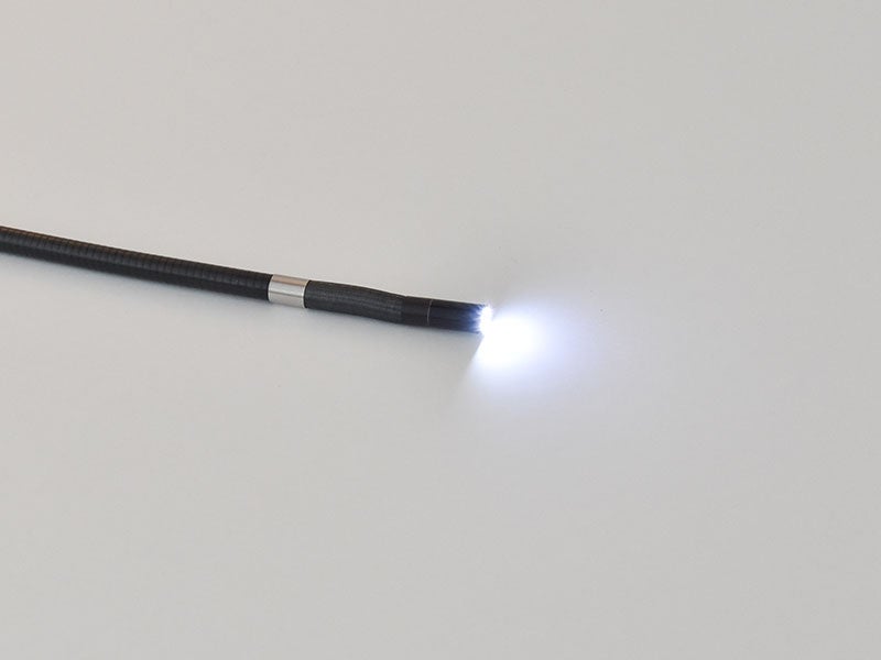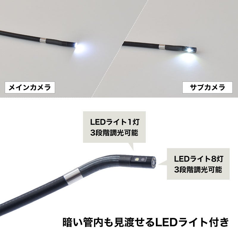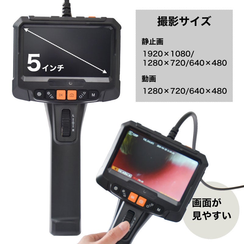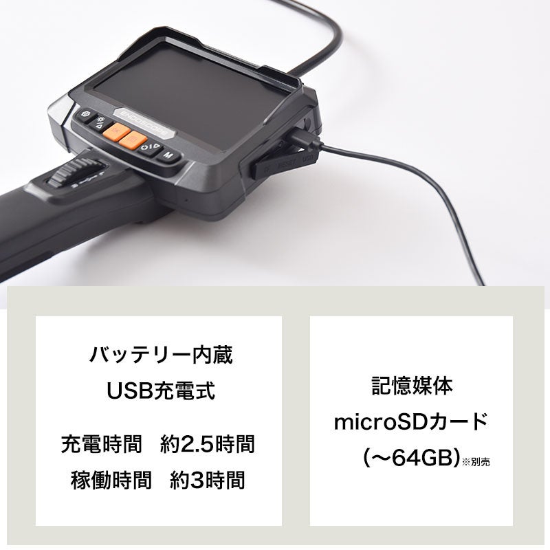 先端カメラは手元のダイヤル操作で210度スムーズに動き、確認したい場所にカメラを合わせることが可能です。自由に曲げられるフレキシブルケーブルを採用。ケーブル長1/2/3mの3種類からお選びいただけます。IP67防水性能(カメラケーブル部)。先端カメラ部に取り付けて使う磁石アタッチメント、フックアタッチメントが付属。3段階の明るさ調整が可能なライトを搭載(正面8灯、側面1灯)。USB充電式。静止画、動画の記録が可能。5インチディスプレイを採用。
