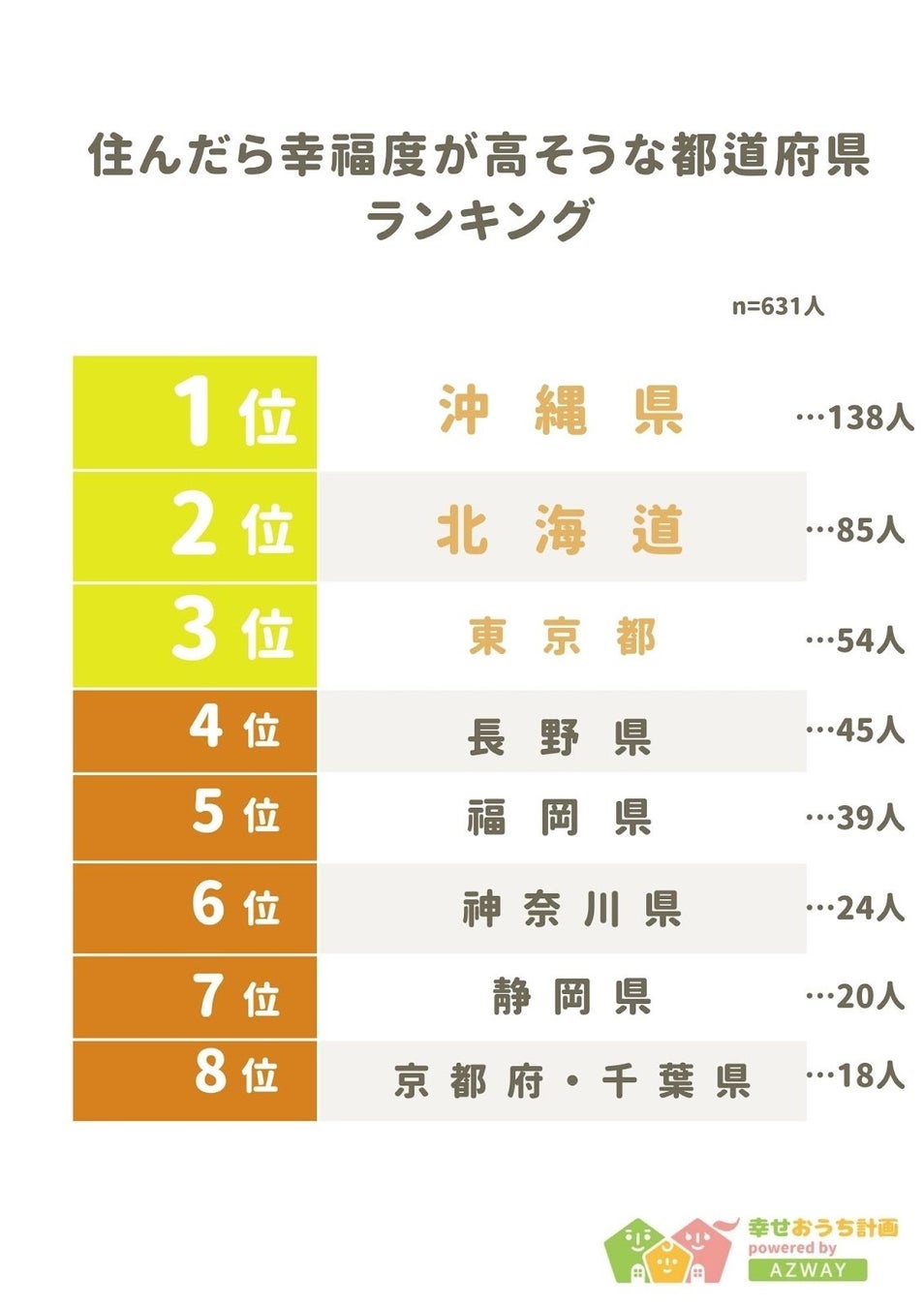 今回、株式会社AZWAY(https://azway.co.jp/)が運営する、幸せおうち計画(https://azway.co.jp/media/)は、10代から60代以上までの631人を対象に「住んだら幸福度が高そうな都道府県」についてアンケート調査を実施しました。