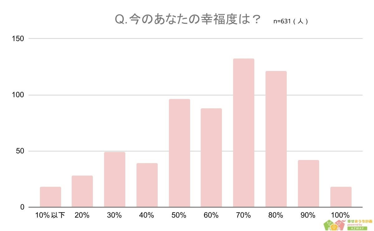 続いて、「今の幸福度」について聞いたところ、70%を選んだ人が132人(20.9%)で1位、80%を選んだ人が121人(19.2%)で2位、50%を選んだ人が96人(15.2%)で3位という結果になりました。50〜80%の満足度の人が半数以上にのぼることがわかります。