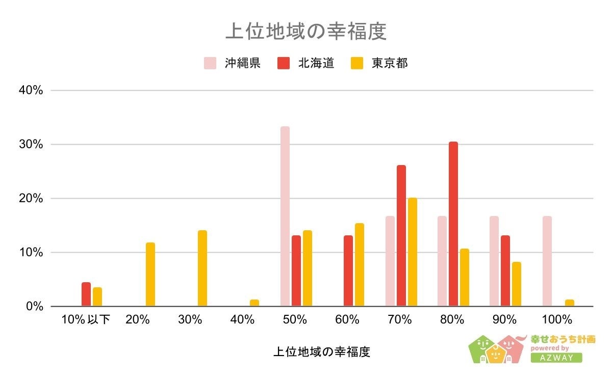 一方、住んだら幸福度が高そうな都道府県ランキングで上位に選ばれていた「沖縄県」「北海道」「東京都」における幸福度を見たところ、沖縄と北海道ではほとんどの人が50%以上の幸福度を感じていることがわかります。