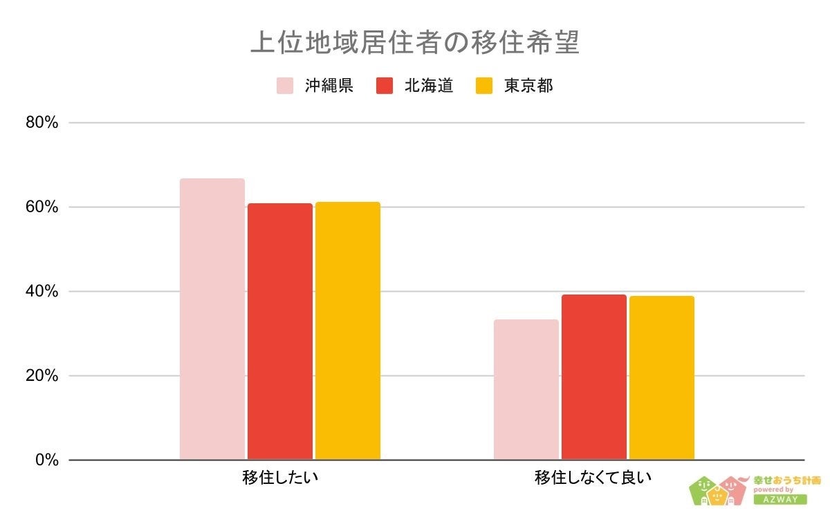 また、住んだら幸福度が高そうな都道府県ランキングで上位に選ばれていた「沖縄県」「北海道」「東京都」の人の移住希望について見たところ、3都道府県の中で沖縄県が一番高い66.7%という結果に。幸福度が高く他の県から人気もある沖縄県ですが、それでも移住したいと思っている住民が多くいるようです。