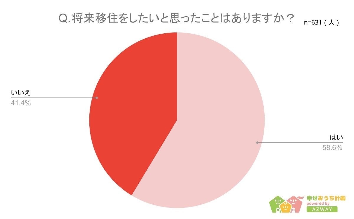 最後に、「将来移住をしたいと思っているか」について聞いたところ、「はい」と答えた人が58.6%、「いいえ」と答えた人が41.4%という結果になりました。6割近い人が移住に魅力を感じていることがわかります。