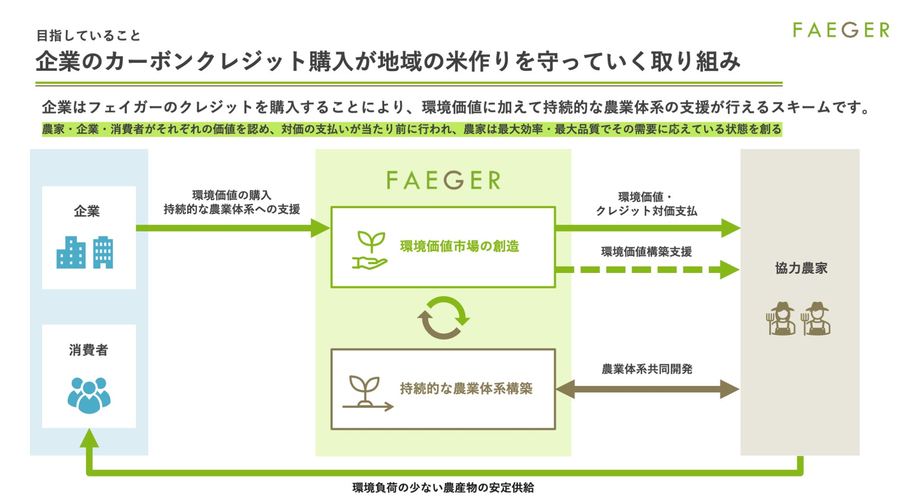 フェイガーは、持続可能な農業の実現を目指し、農業生産者と協力して農地の脱炭素を進めています。さらに、その成果をカーボンクレジットとして企業に活用提案することで、農業と社会をつなぐ新しい価値創出を推進しています。