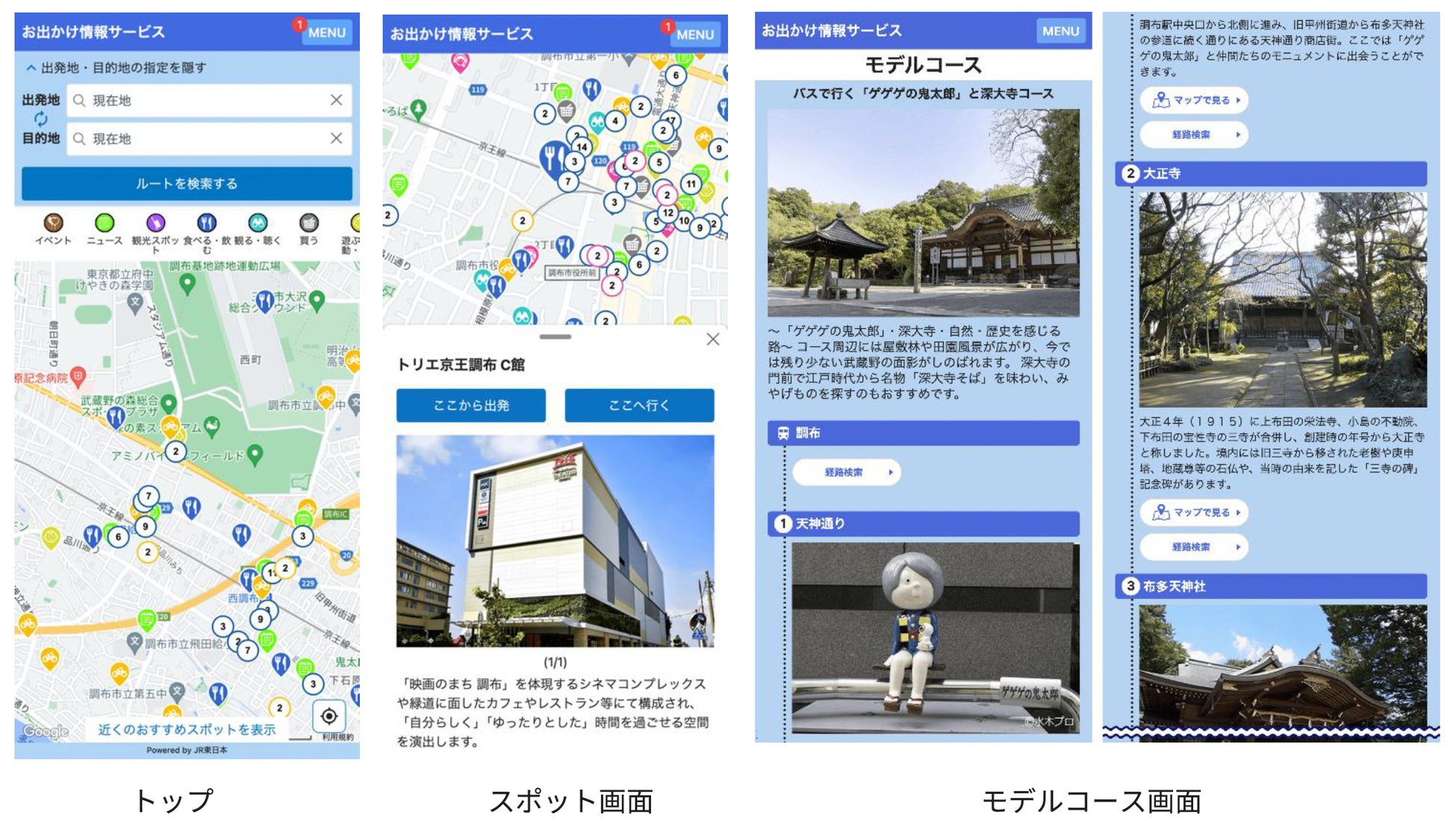 地域メディアとの情報連携(※3)により地域ならではのおすすめのお出かけスポット等の情報をマップ上に表示するほか,あらかじめ設定されたコースを利用者に案内し,調布市内や多摩市内の魅力を満喫していただけます。