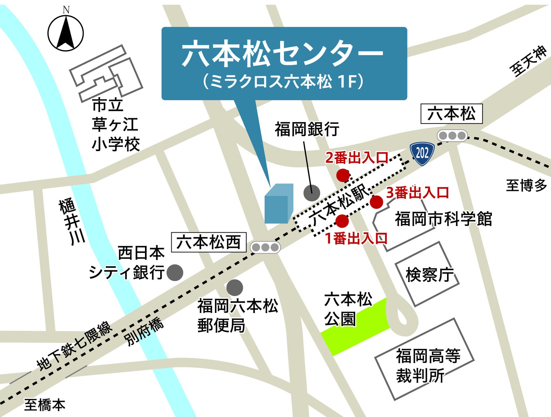 六本松センターは、2023年3月に博多延伸により交通利便性が向上した福岡市地下鉄七隈線「六本松」駅徒歩2分、幹線道路(別府橋通)に面した視認性の高い1階路面に出店いたします。
