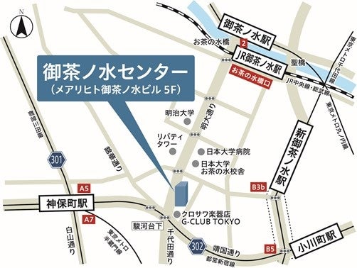 御茶ノ水センターは、JR中央・総武線、東京メトロ丸ノ内線「御茶ノ水」駅より徒歩6分、明大通りに面したオフィスビルの5階に出店いたします。