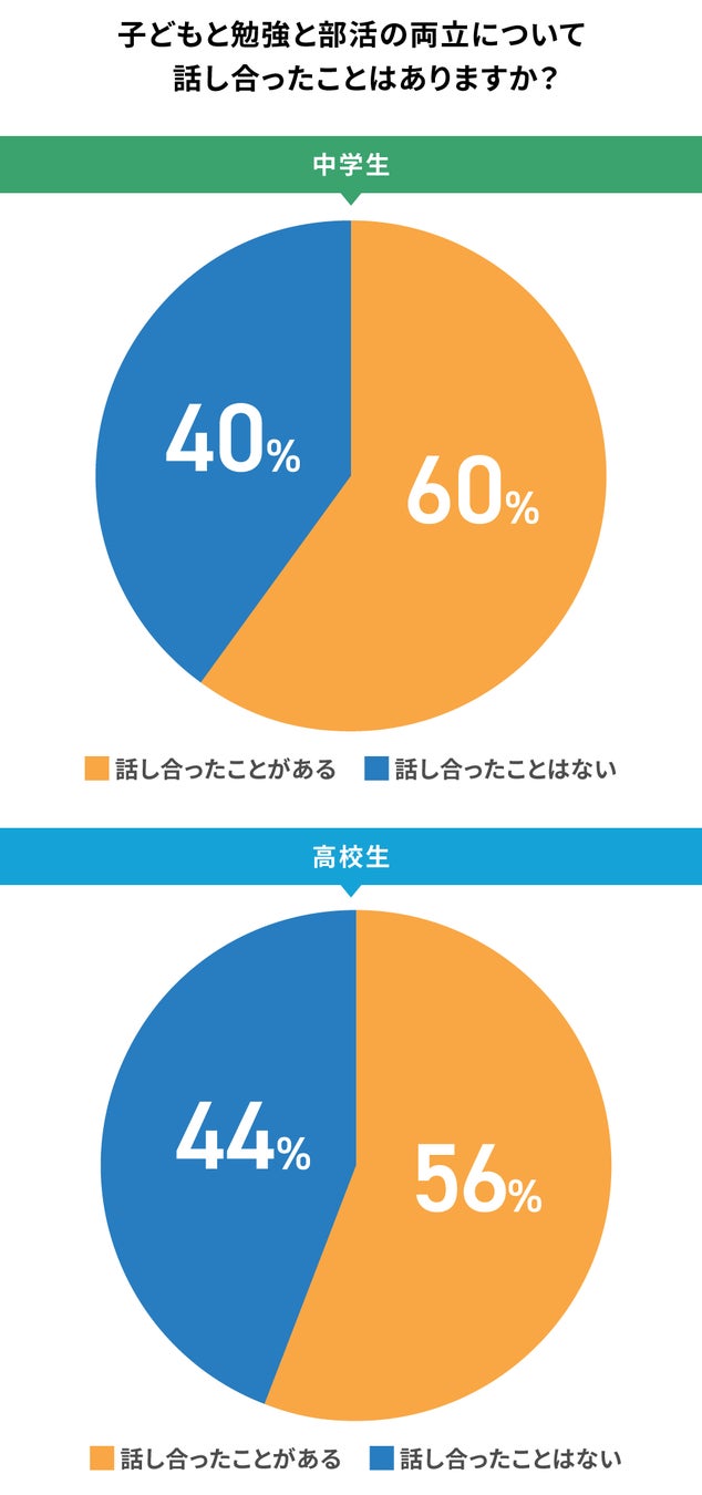 今回の調査では「子どもと勉強と部活の両立について話し合ったことはありますか?」という質問に対し、中学生の保護者の60%、高校生の保護者でも56%が「はい」と回答しました。