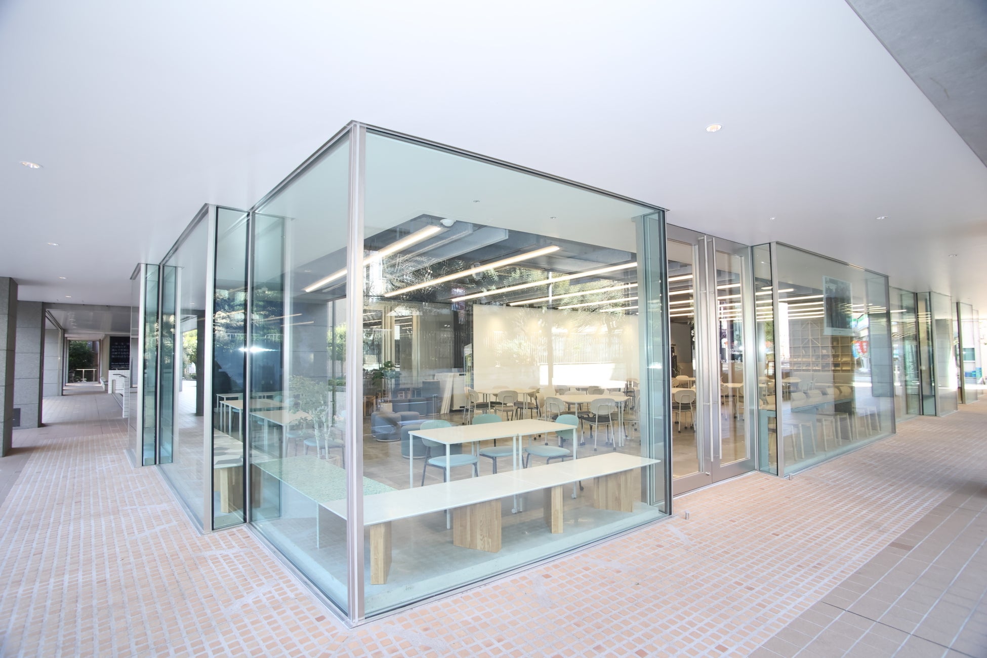 南門通りに面して配置された大きなホワイトボードウォールや、ガラスとベンチによる開放的な構成により、学生・教職員に限らず、地域や来訪者も自然と集い、対話が生まれる場となっています。